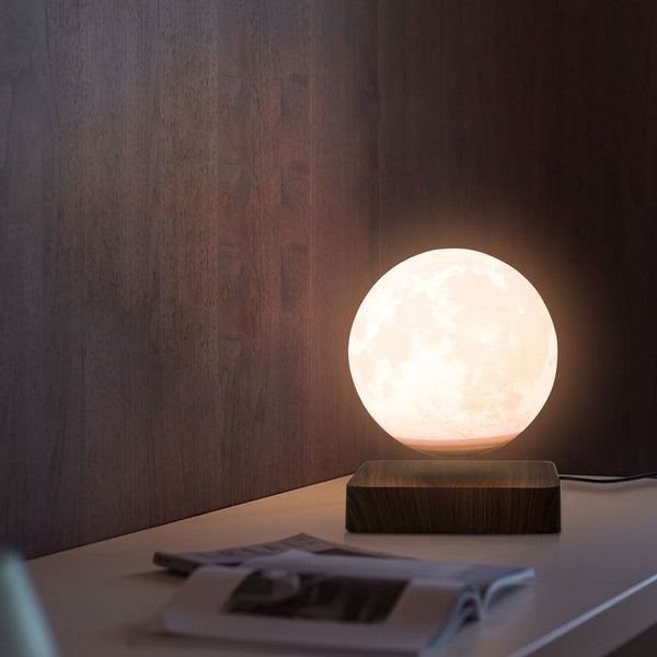 The lamp uses magnetic levitation technology, allowing it to hover and rotate smoothly above the wooden base. 🌌✨