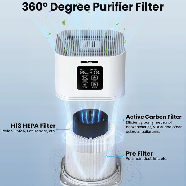 Feature: 3-layer filter system (H13 HEPA + Activated Carbon + Pre-filter). Description: Effectively removes dust, pet hair, smoke, odors, and other harmful particles. Benefit: Provides fresh, clean air all day long, reducing allergies and improving respiratory health.